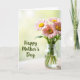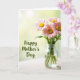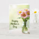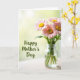 This card shows a small bouquet of pink, daisy-like flowers with sunny yellow centers gathered in a tall, clear glass vase, giving the arrangement a gentle, caring feel ❤️. The thin green stems are visible through the water, like a quiet little detail you notice when you lean in closer. Everything sits on a pale, lightly textured wooden surface that adds a cozy, homey setting without stealing attention from the blooms. Soft backlighting pours in from behind, wrapping the petals in a tender glow and making the scene feel like a calm moment shared between loved ones. The background fades into a blurred wash of light greens and muted yellows, as if a garden is just out of focus. On the left side, the words “Happy Mother’s Day” appear in flowing lettering, set in a deep green that echoes the stems and leaves 🌼. The text is placed with plenty of open space around it, balancing the vase on the right and keeping the layout airy. Behind the flowers, the light turns the backdrop into a smooth, out-of-focus blend of pale green and soft yellow.