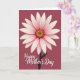 This greeting card features a large open flower centered on a deep, muted crimson background, creating a cozy, affectionate mood ❤️. Long, slender petals fan outward with a gentle gradient from soft white at the tips to blush pink as they draw closer to the center, like a tender embrace. In the middle, a richly textured golden-orange disk adds warmth and attention, echoing the glow of close family bonds. A thin, dark stem drops gracefully toward the bottom, guiding your eye down in a calm, steady line. Near the lower portion, the message “Happy Mother’s Day” appears in flowing white lettering, placed just above the bottom edge and aligned to sit beneath the bloom. The soft, even lighting keeps the colors smooth and soothing, with no harsh shadows, and it gives the petals a quiet, caring look 🌼. The red background stays solid and velvety, making the pale petals and white text stand out clearly. The flower’s golden center is dotted with tiny patterns, and the stem meets the text area just above the lower margin.