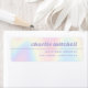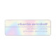 Return address labels with your name in a retro style font and a thin border between your name and return address. The is text aligned to the right on a soft pastel rainbow pattern background.