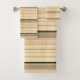 Peach bath towel set with modern stripes in black and grey. The peach towel background color can be changed to suit your style. Beautiful gift idea, personalize with a name. The stripe print image is also removable.
