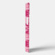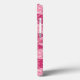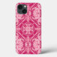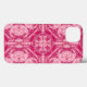 Phone case in an abstract, geometric 4-way mandala pattern in soft shades of fuchsia and pastel pink