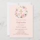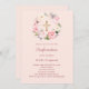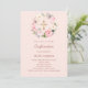A soft pink blush colored background, decorated with watercolored pink and white flowers in a wreath and a golden cross. Personalize and add a name and details.