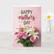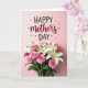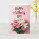 This card features a soft pink background that sets a gentle, affectionate tone ❤️. Near the top, a day-themed message sits in deep green with a warm crimson accent, and small floating hearts are scattered around the lettering. The text is centered and spaced to feel airy, leaving room for the artwork to breathe. Beneath the words, a full bouquet fills the lower half, arranged like a gift offered with a tender, caring gesture. White, trumpet-shaped flowers open wide to show pale yellow-green centers, nestled among deep pink blooms with many layered petals. Green stems and leafy sprigs weave through the arrangement, adding contrast and a fresh garden feel 🌼. Soft, diffused light smooths the colors, and the bouquet is anchored at the bottom with overlapping leaves and blossoms spreading outward.