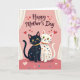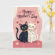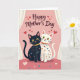 This card shows two upright, human-like cats centered on a soft pink background, sitting close enough that their shoulders nearly touch, as if sharing a quiet, affectionate moment ❤️. One cat is deep black with a small gold collar, and the other is bright white with a red collar, their large golden eyes turned forward with a gentle, friendly glow. Tiny hearts in mixed colors are scattered across their bodies, and more small hearts float in the open space around them like light confetti. A slightly darker rose-toned floor runs along the bottom, giving the pair a grounded spot to sit while keeping the scene simple and airy. On both sides, pale cream drapes hang like stage curtains, creating a cozy, tucked-in setting that feels intimate without being busy. Near the top, the words “Happy Mother’s Day” appear in a deep, dark shade, centered above the cats with extra little hearts clustered nearby 🌼. The overall palette stays soft—pink, cream, and rose—while the collars and hearts add small pops of color, and the curtains curve inward along the left and right edges.