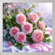 Soft pink roses, displaying their lush, layered petals. These roses are set against a delicate background that may include hints of snow and a dreamy, sparkly ambiance. The leaves are vibrant green, contrasting beautifully with the pink flowers. A strand of pink beads is intertwined among the roses, adding an elegant touch to the composition. The overall scene evokes a sense of beauty and romance, illuminated with a gentle, warm light that enhances the flowers' soft hues.