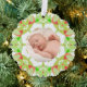 Soft Pretty Green Pastels Custom Christmas Photo Picture Ornament. Jolly and Festive Pastels Green and Juicy Orange Custom Christmas Photo Picture Frame Round Christmas Tree Decoration. A soft colorful circular bauble ornament for your pretty green and orange multicolour themed tree and decorations. The frame design is a merry geometrical abstraction pattern take on traditional color block festive designs. In pastel colors of winter tree green and bright merry orange for a Winter Wonderland. Personalize it by replacing the two photos, on the front and back, with your own for an early gift for family and friends to celebrate Christmas. The stock photo shows a baby sleeping. Cherish your Yuletide memories. A great gift for best friends and brothers and sisters, or couples. A budget friendly keepsake gift, for family celebrations or first Christmases.