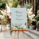 Welcome your guests with timeless elegance using this soft sage green floral wedding sign. The design features delicate white and ivory blooms, subtle greenery, and refined typography, creating a serene and sophisticated look. Perfect for outdoor, garden, or fine art weddings, this customizable foam board adds a romantic touch to your ceremony entrance or reception decor. Personalize with your names and date to complete the elegant first impression.