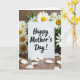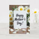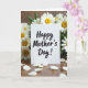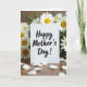 This card stands upright on a warm, wood-toned surface, surrounded by clusters of white, daisy-like flowers with sunny yellow centers that feel like a gentle hug ❤️. The background blooms and green leaves form a soft frame around the card, as if someone arranged them with caring hands to make the message feel closer. Centered on the front, the words “Happy Mother’s Day!” appear in black, brush-stroke-style lettering that contrasts clearly against the bright white card. Soft, diffused light brings out the delicate petal textures and the subtle grain in the wood, creating a calm, affectionate scene. A shallow depth of field keeps the message sharp while the flowers blur slightly behind it, like a quiet moment shared between loved ones. A few loose white petals are scattered across the foreground, adding a tender, just-placed touch 🌼. The card remains the brightest focal point, encircled by crisp white petals, yellow centers, and small green leaves.