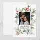 This delicate watercolor bouquet has traditional Christmas colors, forest green, olive green and cranberry red on bright white. The bride and grooms favorite engagement photo are featured in the center of the bouquet with the wedding details directly below. The back side is blank. All text can be edited to suit the needs of your event. Coordinates with the Winter Berry Christmas Wedding Collection.