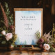 This beautiful wedding welcome sign features a serene watercolor design of a pine forest in soft, natural shades of blue and green. The minimalist layout complements the tranquil outdoor theme, with the couple’s names, prominently displayed in classic serif typography, along with the wedding date below. The soft wash of watercolor at the top gives a dreamy, ethereal vibe, perfect for setting the tone for a romantic outdoor wedding in a rustic, mountain, or forest setting. The sign’s calm elegance makes it ideal for an entrance, ceremony, or reception area, welcoming guests with a gentle nod to nature.