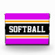 This sporty, athletic design features bold SOFTBALL text inside a highlighted wide center black stripe with white and yellow orange racing stripes against vivid bright tropical pink outer stripes. The text can be personalized.