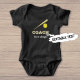 "COACH I'm in charge!" - this is a fun baby bodysuit for anyone who enjoys softball. The white and golden colored text can be personalized by adding a name or your own caption. The accompanying image is a golden softball bat with a bright yellow ball.