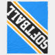 This sporty design features athletic SOFTBALL text inside highlighted wide diagonal black, white, and golden yellow racing stripes against bright blue background. The first and last letters of the word "softball" run off the design edges with a dynamic banner effect.