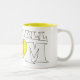 A cute two-tone coffee mug for fastpitch softball moms, with SOFTBALL MOM printed in bold white font and a bright yellow heart-shaped softball in place of the O.
