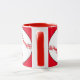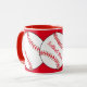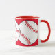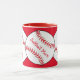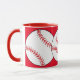 This mug features red and white softballs surrounded by a red background. The text reads: Softball Mom. Easily customize the text for a special sports fan or remove entirely. Great for Mother's Day or any time of year.