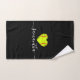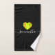 Personalized softball towel with a simple cute heart shaped softball graphic and custom name or text in a feminine girly and modern pretty script font monogram in bright yellow, red, black and white. Any girls or womens softball player would appreciate the elegant look on this modern and minimal useful softball themed gift.