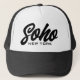 Soho New York trucker hat with script typography. Custom black and white baseball cap for casual wear, sports, golf and more. Stylish hand lettering design for men and women. Available in other cool colors too.