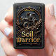 This dark, complex, and intensely detailed design is a commanding tribute to the Agricultural Professional and the Farm Operator, celebrated as the "Soil Warrior." The centerpiece features a robust, dark-colored farm tractor with gold accents, set within a bold, circular industrial medallion frame in bronze and black. The tractor is surrounded by an almost organic mass of dark, intertwining cables, pipes, and mechanical roots that connect it dramatically to the land, symbolizing the deep, complex relationship between the operator, the machine, and the earth. Golden stars and rivets accent the scene, adding a sense of veteran prestige and mechanical mastery. The bold, three-dimensional golden text "SOIL WARRIOR" dominates the lower portion, set against the dark, textured background. This custom piece is an ideal accessory celebrating the mastery, veteran status, and imposing command held by the farmer over the intricacies of soil and machine.