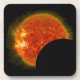 The dark shadow of the moon crosses in front of the sun during a solar eclipse captured in space and enhanced in this image.