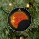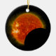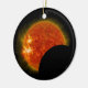 The dark shadow of the moon crosses in front of the sun during a solar eclipse captured in space and enhanced in this image.