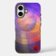 This case has an artistic abstract cosmic design with geometric shapes and beautiful, transparent / watercolor like colors (purple, yellow, orange). This product can be customized by adding text.