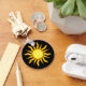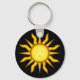 Golden yellow sun glyph with subtle electrical outlet face on a black keychain.