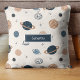 Love space? This throw pillow adds a great custom touch to your home bedroom or nursery. The pattern has drawings of planets Mercury, Venus, Earth, Mars, Jupiter, Saturn, Uranus, and Neptune, as well as a drawing of the moon. The drawings are sketched in boho style and the colors are in shades of brown and blue. Pillow may be personalized with a name or other text.