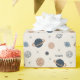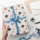 Love space? This wrapping paper adds a great custom touch to your gift. The pattern has drawings of planets Mercury, Venus, Earth, Mars, Jupiter, Saturn, Uranus, and Neptune, as well as a drawing of the moon. The drawings are sketched in boho style and the colors are in shades of brown and blue. Gift wrap may be personalized with a name or other text.