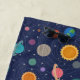 A fun and modern solar system pattern with colorful planet, star and sun illustrations against a dark blue background.