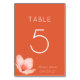 Modern table numbers for your wedding reception or rehearsal dinner in trendy bright orange. This shade of orange is called Verona Sunset. Details in faux gold, a silhuette of a delicate flower. Modern typography in contemporary style.