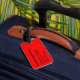 Luggage tag with name and address on a solid red background color. Personalize with your name and address information using the easy templates. Font color, font style, and font size are customizable.