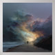 A lone figure strides down a misty coastal path straight into a colossal, glowing storm cloud that towers over the sea like a radiant portal. Layers of turquoise, teal, lavender, indigo, and blazing orange-gold swirl with inner light, while gentle waves reflect rose and silver fragments along rocky shores. Thick fog veils distant cliffs, amplifying depth, solitude, wonder, and quiet resolve. The scene radiates introspection, courage at life’s thresholds, transformation, awe before nature’s sublime power, and the beauty of moving forward into the unknown—perfect for meditation rooms, bedrooms, home offices, therapy spaces, modern minimalist decor, or as deeply symbolic gifts for anyone embracing change, personal growth, spiritual journeys, resilience, or quiet strength.