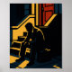 This striking design captures a moody, atmospheric night scene in a classic film noir style. A man, silhouetted against a brightly lit doorway, sits contemplatively on a city stoop next to his briefcase. The high-contrast lighting, with its deep shadows and dramatic yellow glow, creates a sense of mystery and solitude. This illustration is perfect for fans of graphic novels, retro aesthetics, and urban nightscapes. The bold use of color and shadow makes this a powerful and evocative piece.