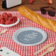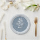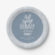 Cute "some Bunny" birthday party paper plate. White typography with bunny ear accent. Hand-drawn basketweave pattern border in dusty blue.