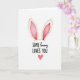 This greeting card features two large bunny ears near the top, painted in soft off-white with a light beige outline and warm pink inside for a gentle, affectionate look 🐰. The ears sit against a bright white background, leaving lots of open space that makes the design feel calm and close. Centered beneath the ears, the words “SOME bunny” appear in a flowing, cursive-style lettering in dark gray, with the letters slightly varied like brush strokes. Just below that, “LOVES YOU” is set in uppercase, simple lettering in the same dark gray, giving the message a steady, sincere tone. The spacing between the lines keeps the layout tidy and easy to read, like a quiet note meant for someone special. Under the text, a painted heart in rich fuchsia adds a romantic touch, like a small hug held in color 🌷. The heart has soft watercolor edges and sits centered below the words on the white background.