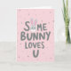 This card features the phrase “SOME BUNNY LOVES U” centered on a soft pastel pink background, with the letters in a muted gray that feels gentle and friendly. The “O” in “SOME” is replaced by a cute gray bunny head 🐰, giving the message a flirty twist as if the little character is leaning into the words. The bunny has wide, soft eyes, a small sweet smile, and tall ears with pale pink inner details, adding a tender, affectionate look. The text sits in the middle of the vertical layout, with the bunny nestled right inside the first line so it feels like part of the conversation. Around the wording, small dark gray five-pointed stars are scattered loosely across the pink field, like a quiet night-sky pattern. The simple shapes and soft shading keep the focus on the bunny’s warm expression and the cozy closeness suggested by the message 🐇. Against the blush background, the gray lettering and star accents stand out gently, and the bunny’s ears show a light pink tint that matches the backdrop. The final detail is an uneven sprinkle of tiny dark gray stars surrounding the centered text on the pink background.