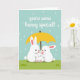 Designed with a tall, centered layout, three rounded white bunny figures cuddle close beneath a bright yellow umbrella 🐰. Two larger bunnies wrap their arms around a smaller one, and their gentle tilt toward each other reads like a quiet promise of care and closeness. Soft pink accents tint the inner ears, and tiny pink paw pads show on the little bunny as it nestles in. The background is a pale blue sky sprinkled with small white teardrop shapes, suggesting a light rain that makes the huddle feel even more intimate. A fresh green ground sits at the bottom with darker green shapes that hint at leafy growth. Near the top, the phrase “you’re some bunny special!” is placed across the upper half in a flowing, handwritten-style look, set in a dark tone that stands out against the sky 🌷. The umbrella’s curved handle arcs down toward the group, and the raindrops are spaced evenly across the blue above them.