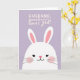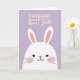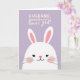 This card features a sweet white bunny🐰 with long ears peeking up from the bottom edge against a soft lavender background, like it’s leaning in for a shy hello. Its small dark eyes, tiny lashes, and gentle curved smile create a tender, friendly look that feels like a quiet inside joke shared between two people. A pink heart-shaped nose and two rosy cheek spots add a flirty touch, while light gray whiskers spread softly across its face. Near the top, the word “HUSBAND” appears in light cream, set in a simple, easy-to-read style. Just below it, “somebunny loves you!” is written in the same cream color in a flowing, cursive-like look, ending with an exclamation point. The roomy lavender space around the text keeps everything calm and cozy, like a note left on the kitchen counter with a 🌷 beside it. The bunny’s ears reach upward toward the lettering, and the pale cream words stand out gently against the purple backdrop.