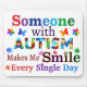 Inspirational Autism quote of “Someone With AUTISM Makes Me SMILE Every Single Day” with colorful Autism puzzles, beautiful flowers, and butterflies to support autistic children and their families.