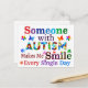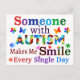 Inspirational Autism quote of “Someone With AUTISM Makes Me SMILE Every Single Day” with colorful Autism puzzles, beautiful flowers, and butterflies to support autistic children and their families.