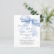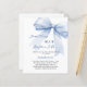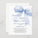 An elegant white background, decorated with blue bow. Personalize and add a name and party details.