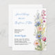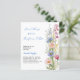 A chic white background. Decorated with a wildflowers in pink, blue, yellow. Personalize and add the name of the bride to be and party details. Text: Something blue Before I do.
