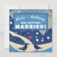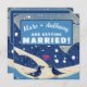 Celebrate your winter destination wedding with this easy to update template. Simply fill out the name, age, date, time, location of party and any RSVP notes or other information. Change from "Marc and Anthony are getting Married!" to "the Willoughby's are hosting Christmas!" Available in many designs for every occasion. The charming design features a variety of blues, creams and white snow falling in a hilly winter scene with two love birds and a bright pink red and Purple Heart floating above their loving gaze.