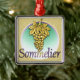 The original illustration on this Ornament features a golden bunch of grapes. A gold pin like this is worn by a sommelier. A sommelier, or wine steward, is a trained and knowledgeable wine professional who specializes in all aspects of wine service as well as wine and food pairing. In this illustration, the grapes light up the deep purple letters "sommelier", like sunshine in the vineyards. A round green shape echoes the wine bottle and the greens and deep reds of the vineyard. A cork textured background surrounds the scene.