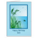 A lovely sea fishing scene. A wonderful birthday card for a son who loves fishing, or just loves the sea. Tall grasses frame a view of a calm ocean with a small boat and a man fishing. The inside verse has the fisherman's good luck wish 'tight lines'.