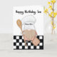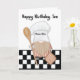 Certainly! A whimsical and endearing Son Birthday card featuring a delightful gnome baker. The front of the card showcases an adorable gnome donning a charming baker's hat, immersed in the joy of baking. With a wooden spoon in hand, the gnome exudes a playful and mischievous expression, radiating a sense of warmth and happiness. The gnome is set against a stylish black background adorned with checkered patterns, creating a visually striking contrast and adding a touch of sophistication to the design.