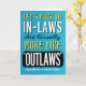 Wish your Son-in-law a happy birthday by complimenting him with this fun card featuring this message: Let's Face it! In-laws are usually more like "OUTLAWS" (Especially Sons-in-Law! Just Sayin'). Design appears in bold white, yellow, and black letters on blue background. Inside has this message but can be customized with your own message. Thankfully, having a son-in-law as WONDERFUL as you makes you an EXCEPTION to this rule! Hope your birthday is great!