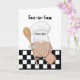 The front of the birthday card for your son-in-law showcases a jovial gnome with a magnificent, bushy beard, dressed in a vibrant chef's hat and apron. The gnome is merrily wielding a wooden spoon in one hand and holding a pot holder in the other. The card exudes a warm and inviting atmosphere, capturing the essence of culinary joy and creativity.