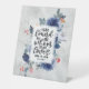 Inspirational quote scripture pedestal sign depicts an elegant floral watercolor design with dark blue flowers and red berries on a gray background. It features Bible Verse Song of Solomon 3:4, "I have found the one whom my soul loves." *