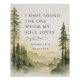 Personalized wedding poster depicts a nature watercolor design including a simple stream of water surrounded by forest pine trees and mountains in earth tone shades of sage, green and tan. It features Bible Verse Song of Solomon 3:4, "I have found the one whom my soul loves." Customize the poster with names.